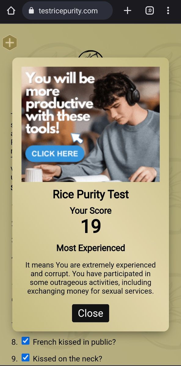 Für alle die den Test nicht kennen: Es handelt sich dabei um 100 Fragen die auf sexuelle Erfahrungen, Kontakt mit Drogen und Kriminalität abzielen. Am Schluss bekommt man einen Score zwischen 0-100 Punkte, je mehr Punkte man hat desto "unschuldiger" ist man 🤓